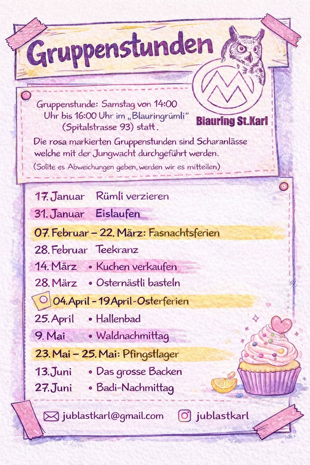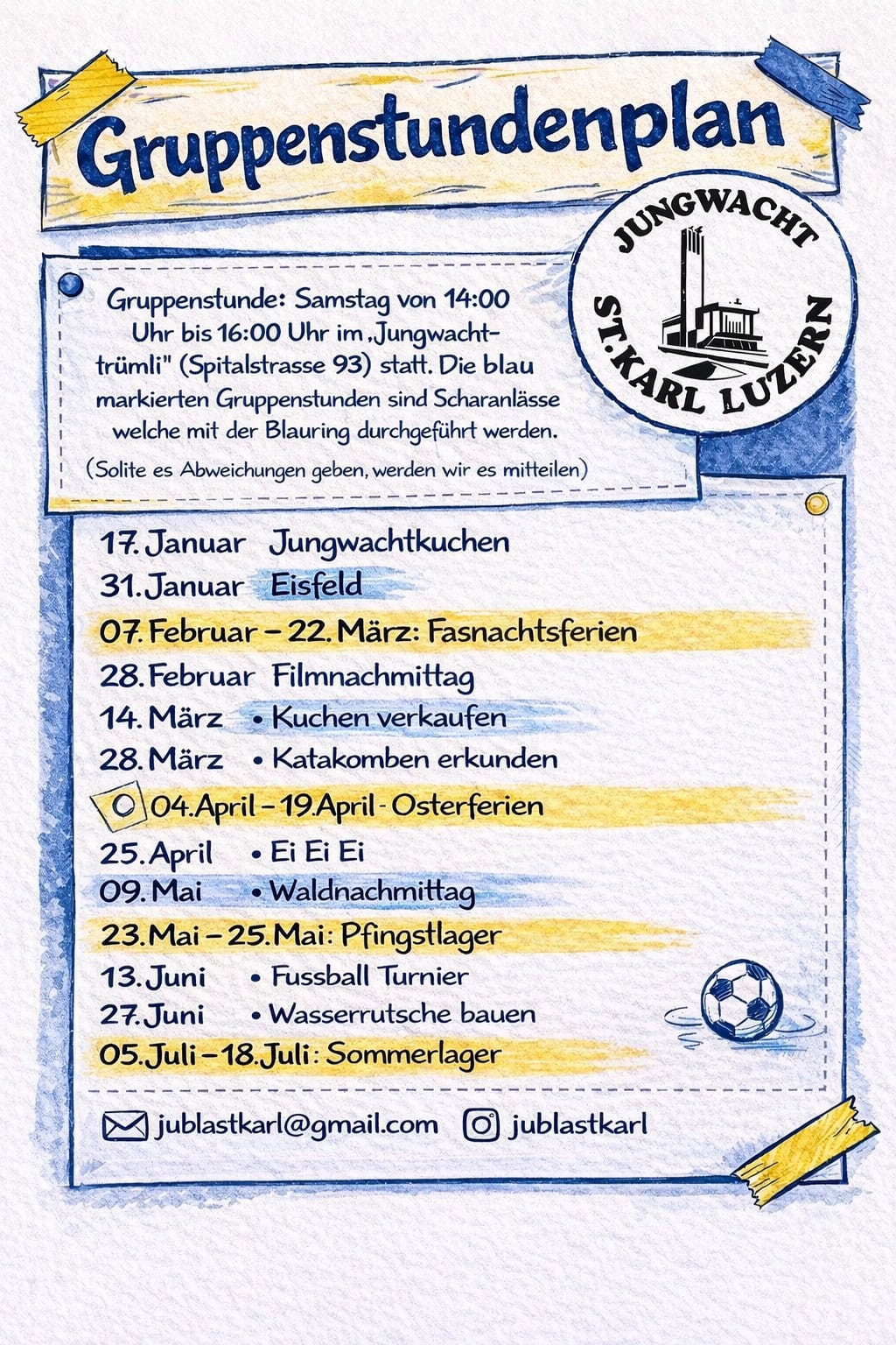 Jubla St.Karl Besser för dech Jubla St.Karl Besser för dech Lebensfreu(n)de Veranstaltungen & Daten Gruppenstunden jeden zweiten Samstag von 14.00-16.00 erste Gruppenstunde: 23.08.2025 Lagerrückblick, im Pfarreisaal St. Anton: 10.10.2025, 18:30 [ /] Jubla Über uns Kontakt Downloads Galerie Gästebuch Räumlichkeit Spitalstrasse 936004 Luzern Kontaktieren jublastkarl[at]gmail.com FolgenFolgen